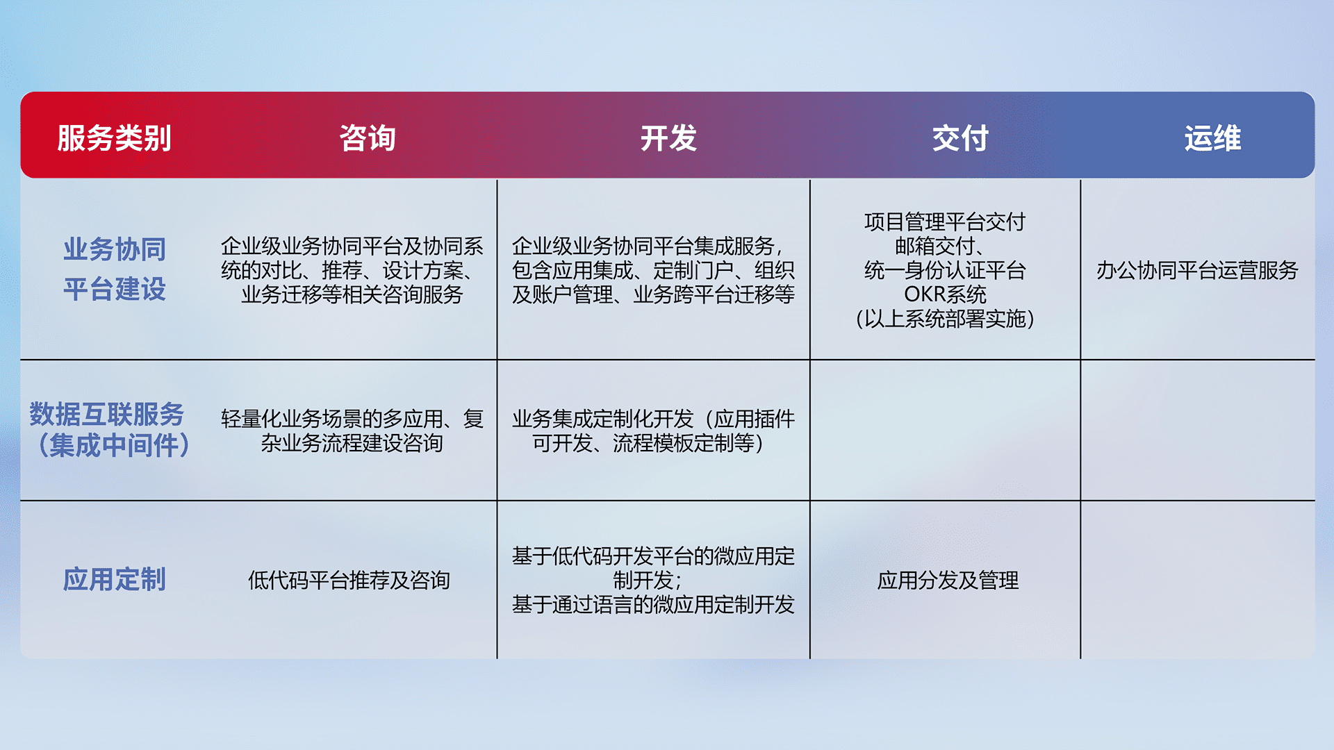 针对钉钉、、、、企微、、、、IDaas等平台级产品提供产品的规划、、、、方案、、、交付、、、、定制化开发等服务,,,实现如统一协同办公、、智能客户服务、、混合会议管理、、智能数据查询、、、等业务场景,,,实现数字化转型。。。